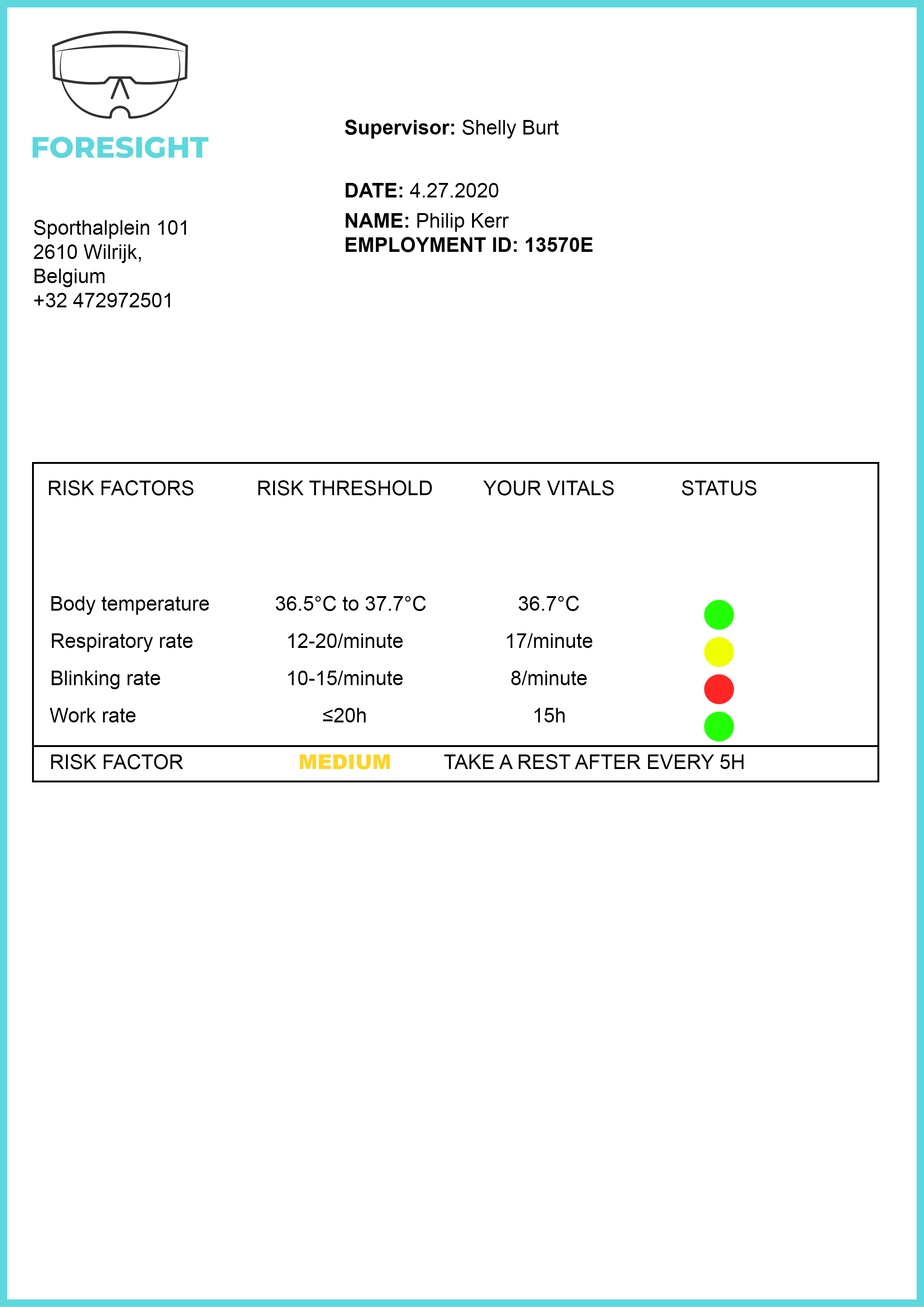 Foresight PPE is integrated with sensors that can continuously monitor eye blinks, temperature (Version 1.0) and respiration rate (Version 2.0). Real-time data is sent to the platform for further processing. The platform makes use of a machine learning algorithm that is capable of tracking the eye blinks and building a fatigue index. The core of our proposed method is a Hierarchical Multiscale Long Short-Term Memory (HMLSTM) network, that is fed by detected blink features in sequence. Based on the fatigue levels, the system alerts the user and this allows the user to follow up with their health status